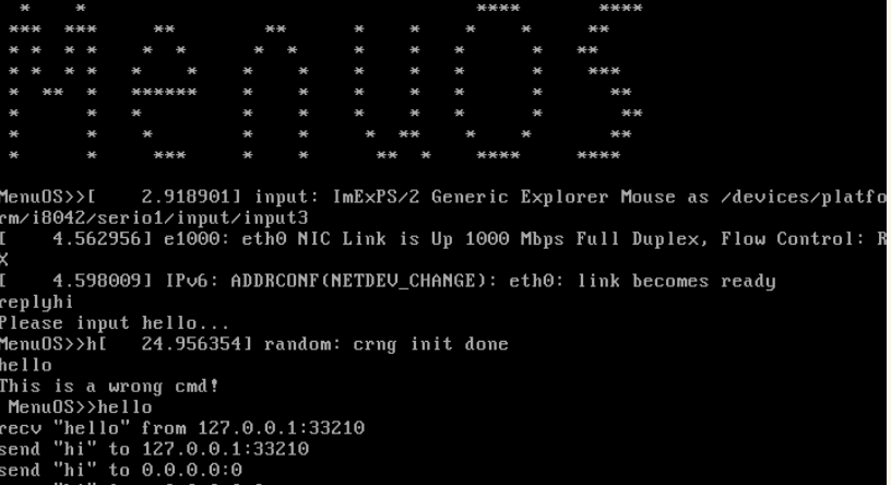 - 截图证实已经在MenuOS上能够完成TCP客户端和服务器发送和接收hello/hi,也就是MenuOS的网络可以正常工作