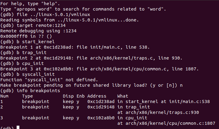 qemu -kernel ../linux-5.0.1/arch/x86/boot/bzImage -initrd ../rootfs.img -append nokaslr -s -S