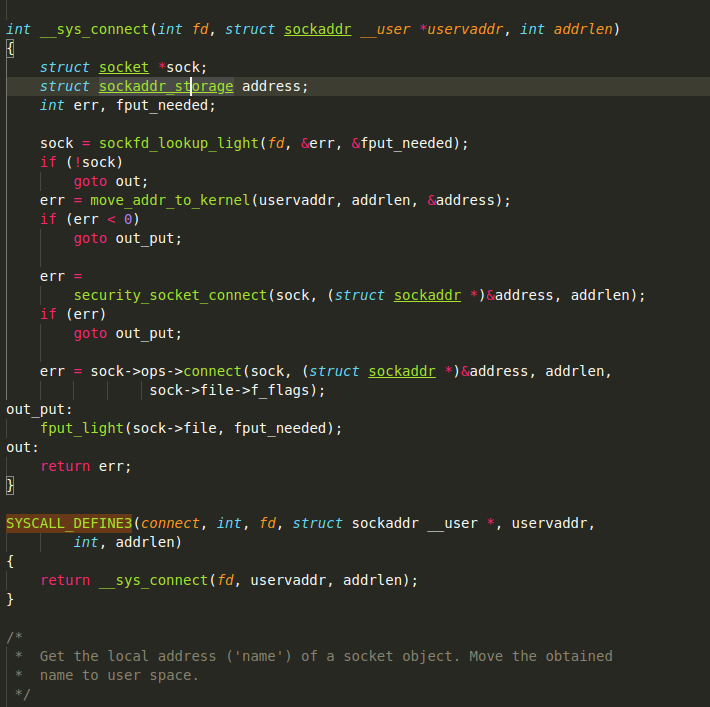 该函数首先检查socket地址长度和使用的协议族,然后再检查socket的状态,必须是SS_UNCONNECTED或SS_CONNECTING,检查完毕后调用实现协议的connect函数,对于流式套接字,实现协议是tcp,调用的是tcp_v4_connect();对于阻塞调用,等待后续握手的完成;对于非阻塞调用,则直接返回 -EINPROGRESS。