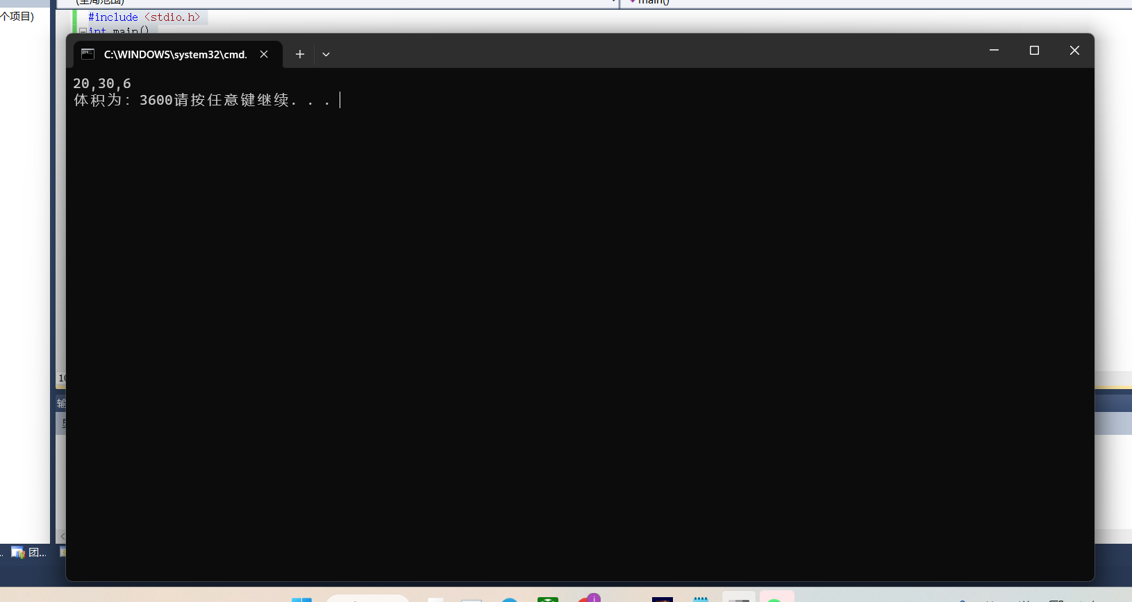 #include <stdio.h> int main() { int a,b,c; scanf("%d,%d,%d",&a,&b,&c); printf("体积为:%d",a*b*c); }