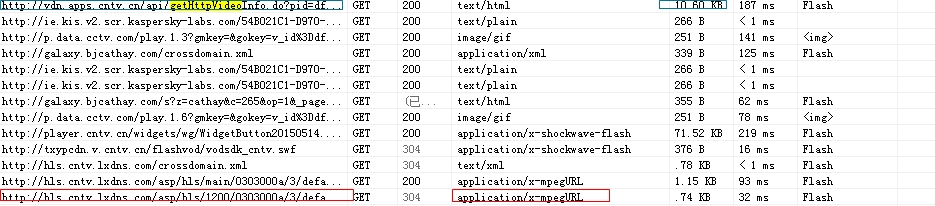 继续往下面找,看到很多video/MP2T的标签,这个是ts流媒体文件的类型,所以在以上两行记录之间的其他行里继续找由Flash发起的请求,就看到了http://vdn.apps.cntv.cn/api/getHttpVideoInfo.do?,而且接收大小有10.6KB,跟我们平常见到index.m3u8文件大小差不多。