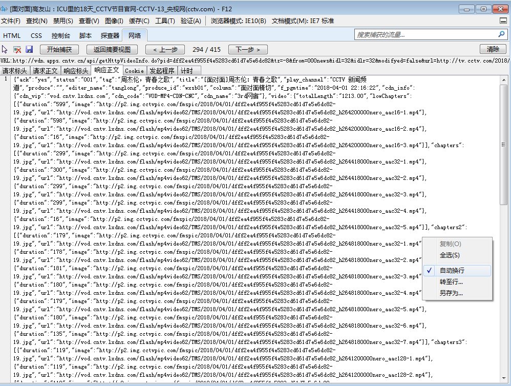 就打开看看吧。双击那一行,选择“响应正文”标签,一看,应该是个json文件,有很多mp4的链接。