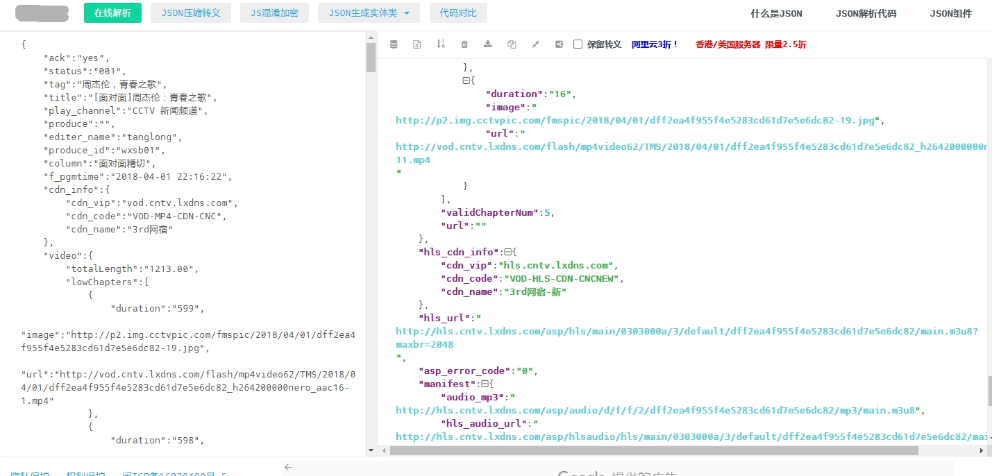 所以现在重点回到了getHttpVideoInfo.do参数的分析。完整的url是"http://vdn.apps.cntv.cn/api/getHttpVideoInfo.do?pid=dff2ea4f955f4e5283cd61d7e5e6dc82&tz=-8&from=000news&idl=32&idlr=32&modifyed=false&url=http://tv.cctv.com/2018/04/01/VIDEYI7D9VFtnbOjIeIP4Pcn180401.shtml&tsp=1598349127&vn=1540&vc=3204F3DC432A4C0DE9C770BE00B8ED93&uid=C2BD12DEC005F94C4858A92ED76D622D",这么长,哪些参数是可以舍弃的呢?到现在大家都应该对"dff2ea4f955f4e5283cd61d7e5e6dc82"这个重复出现的文本比较有印象了。于是我们大胆求证,用浏览器访问http://vdn.apps.cntv.cn/api/getHttpVideoInfo.do?pid=dff2ea4f955f4e5283cd61d7e5e6dc82,就能获取到了带hls_url的json。(谢谢cctv的程序员)当然,要读懂json还是要有一点编程基础的。