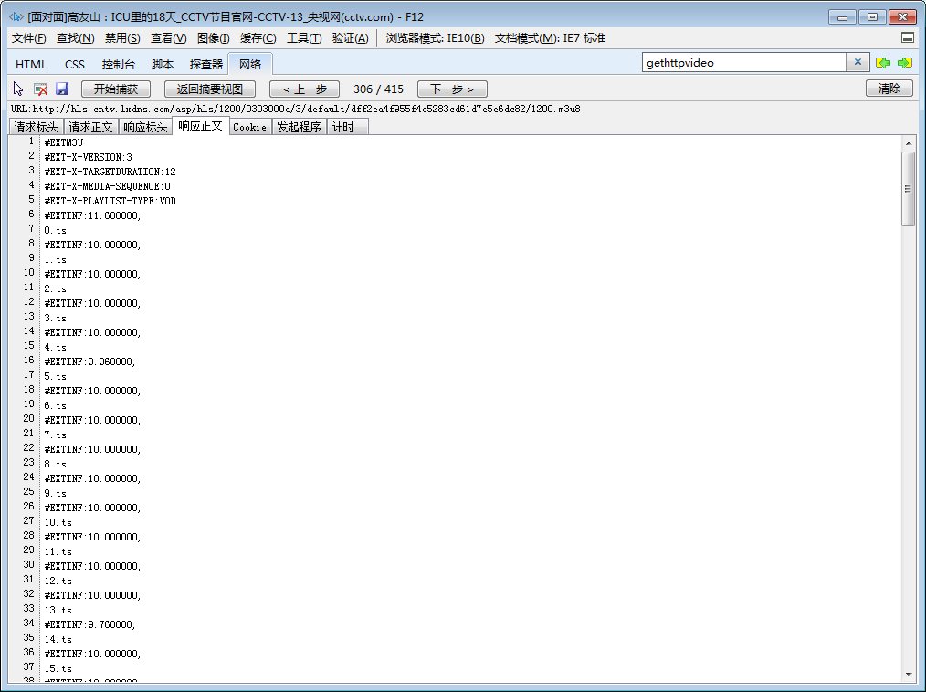 在开发面板双击上述1200.m3u8的一行,看“响应正文”,是一个标准的m3u8文件,其中每个文件名N.ts是要接在“http://hls.cntv.lxdns.com/asp/hls/1200/0303000a/3/default/dff2ea4f955f4e5283cd61d7e5e6dc82/”后面的。m3u8文件主要有两种描述路径的格式,因为这里是较简单的一种,所以就不提及较复杂的那一种了。
