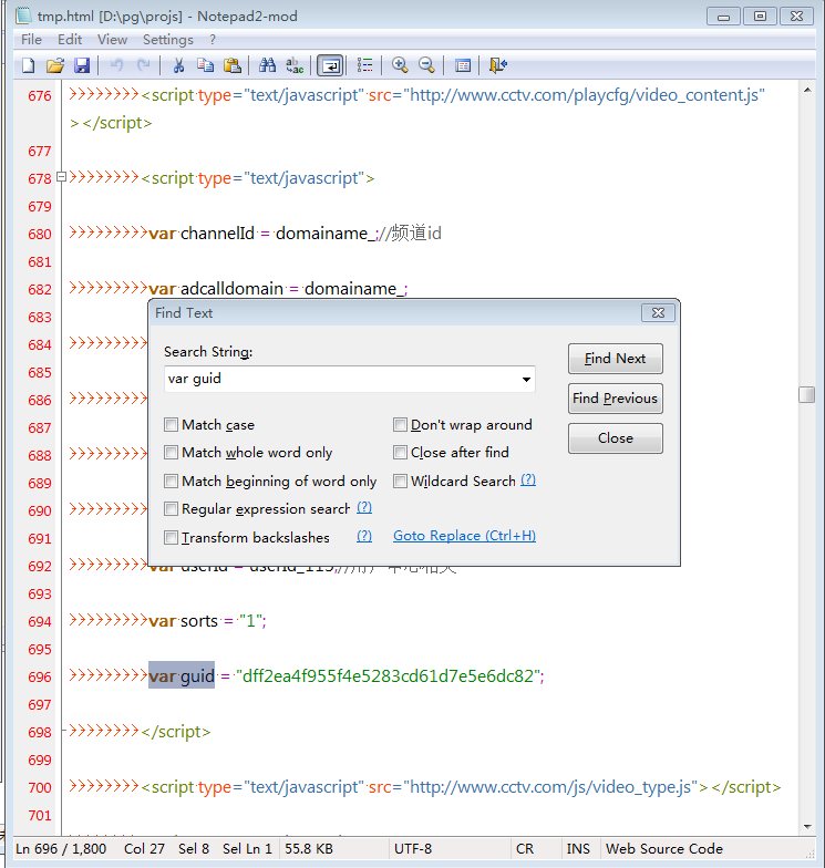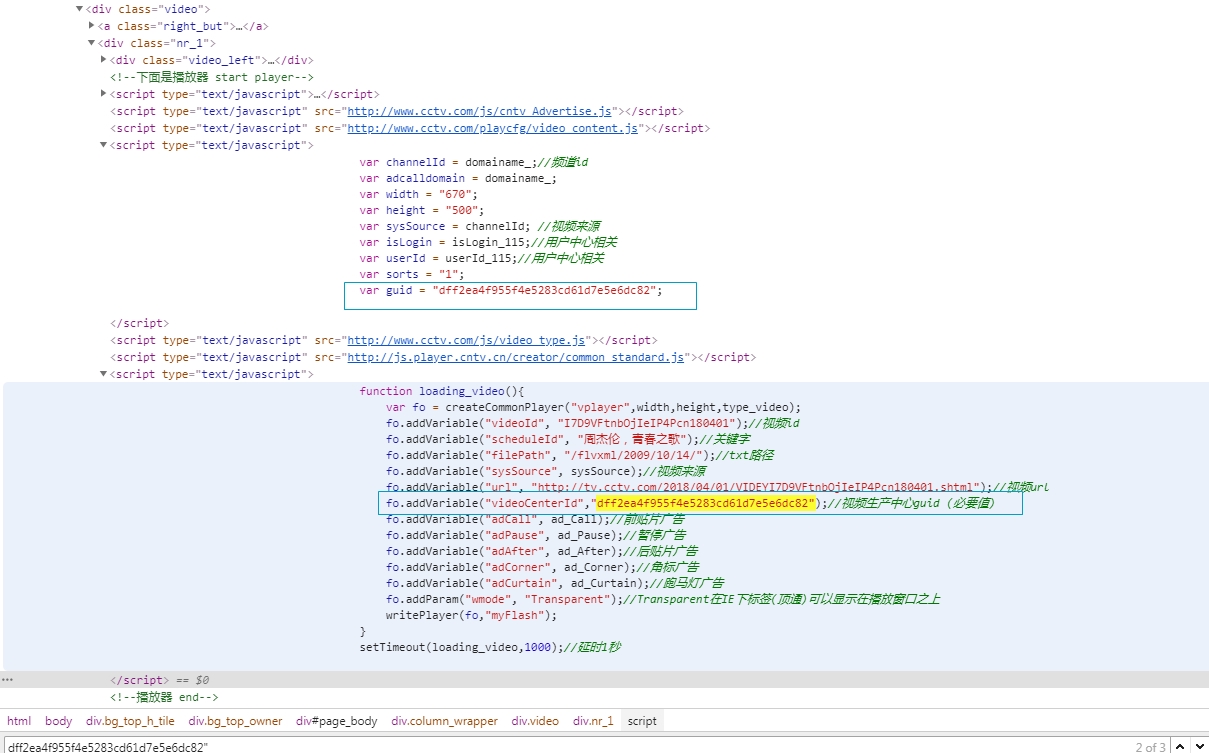 在网页<head>标签看到用utf-8编码。我们先把网页的裸html用脚本下载下来,可以搜索到var guid这一个语句。所以不用另外下载其他js脚本。