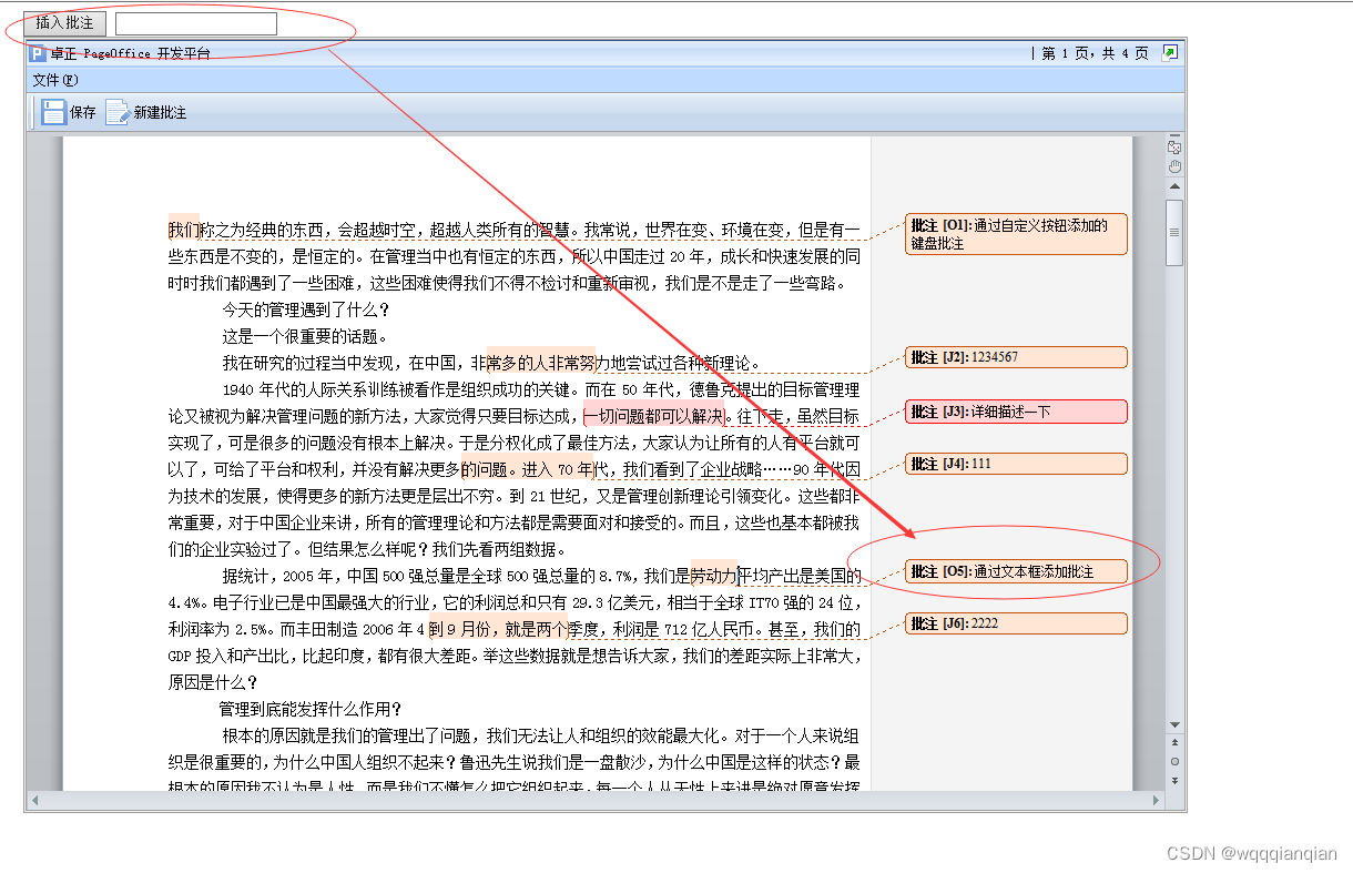 批注是作者或者审阅者根据自己的修改意见,给文档添加的注释或者注解,通过查看批注, 用户可以更加详细地了解文档某些部分的修改意见。用户可以通过office本身的功能新建批注或者通过PageOffice提供的接口给文档新建批注,不了解office本身批注功能的用户可以网上自己搜索一些资料学习研究一下,此处不再赘述。PageOffice也提供了新建批注的功能。
