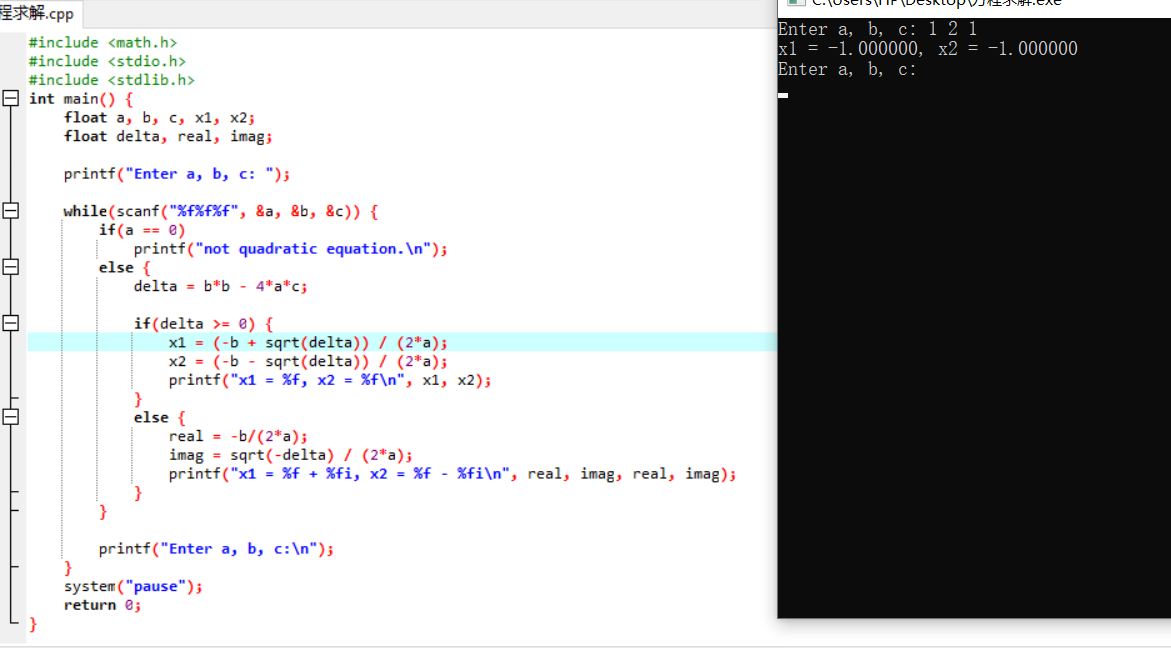 printf("x1 = %f + %fi, x2 = %f - %fi\n", real, imag, real, imag);