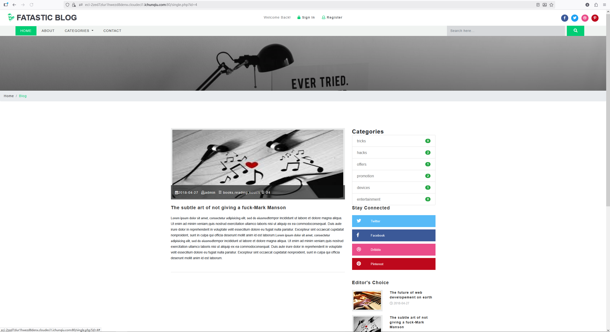 Fantastic Blog (CMS)是一个绝对出色的博客/文章网络内容管理系统。它使您可以轻松地管理您的网站或博客,它为您提供了广泛的功能来定制您的博客以满足您的需求。它具有强大的功能,您无需接触任何代码即可启动并运行您的博客。 该CMS的/single.php路径下,id参数存在一个SQL注入漏洞。