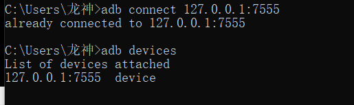 我这里是Windows所以输入了 adb connect 127.0.0.1:7555 效果如下图