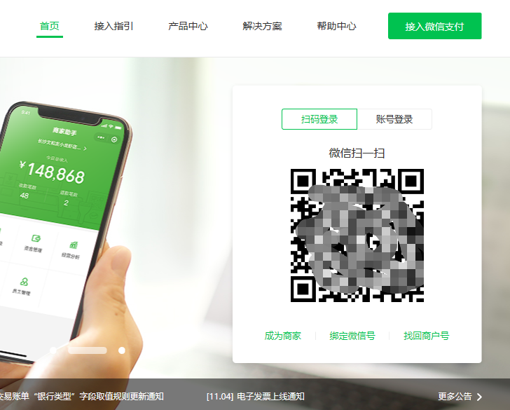 用微信扫二维码登录,在手机微信上确认,并选择您绑定商户号(先要申请商户号,并与管理员的微信进行绑定),扫描界面如下图: