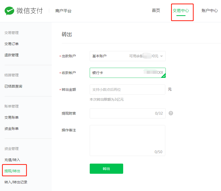 资金转出操作,在上面点击“交易中心”,左边选择“提现/转出”,界面如下: