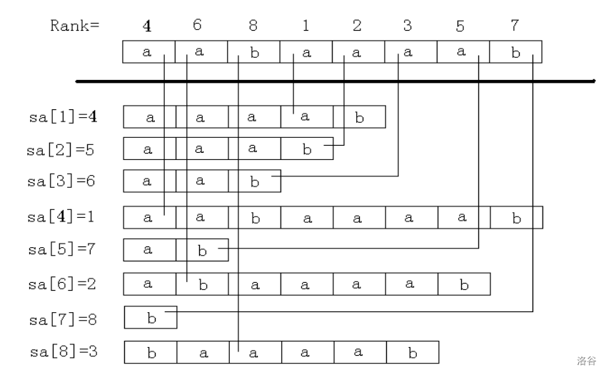 对于字符串 \(s\),定义两个数组 \(sa,rk\),其中 \(sa[i]\) 表示排名为 \(i\) 的所有后缀中的后缀 \(j\) 的 \(j\),\(rk[i]\) 表示后缀 \(i\) 在所有后缀中的排名。