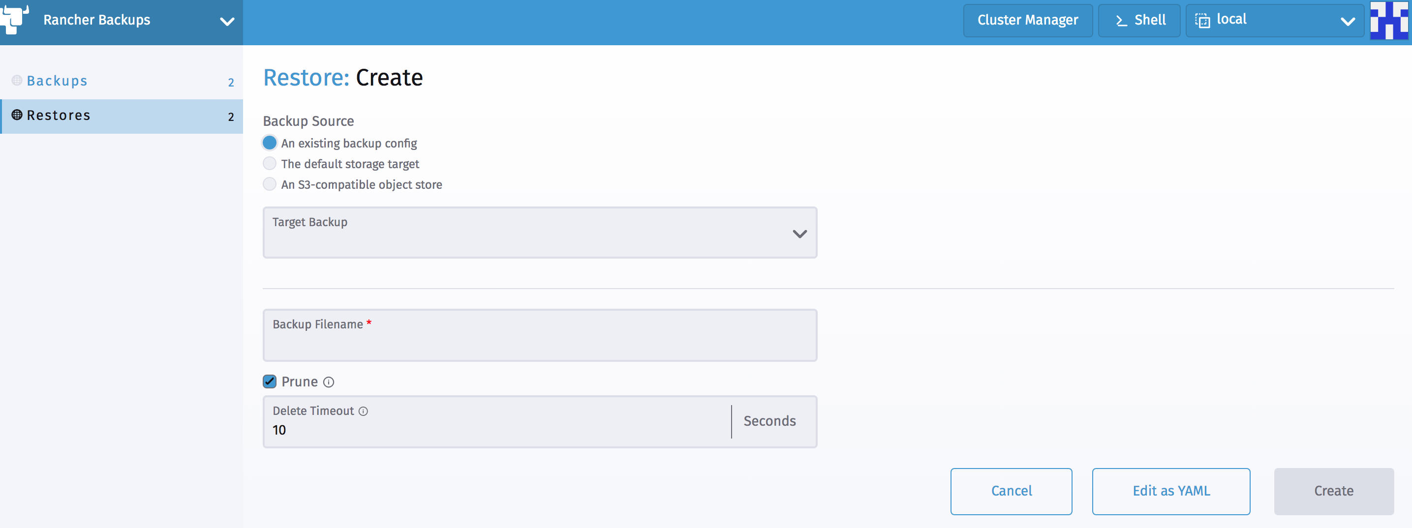 如果您要从 operator 级别配置的默认存储位置的备份文件中恢复,请选择此选项。operator 级别的配置是指安装或升级 rancher-backup operator 时配置的存储位置。在备份文件名字段中提供准确的文件名。