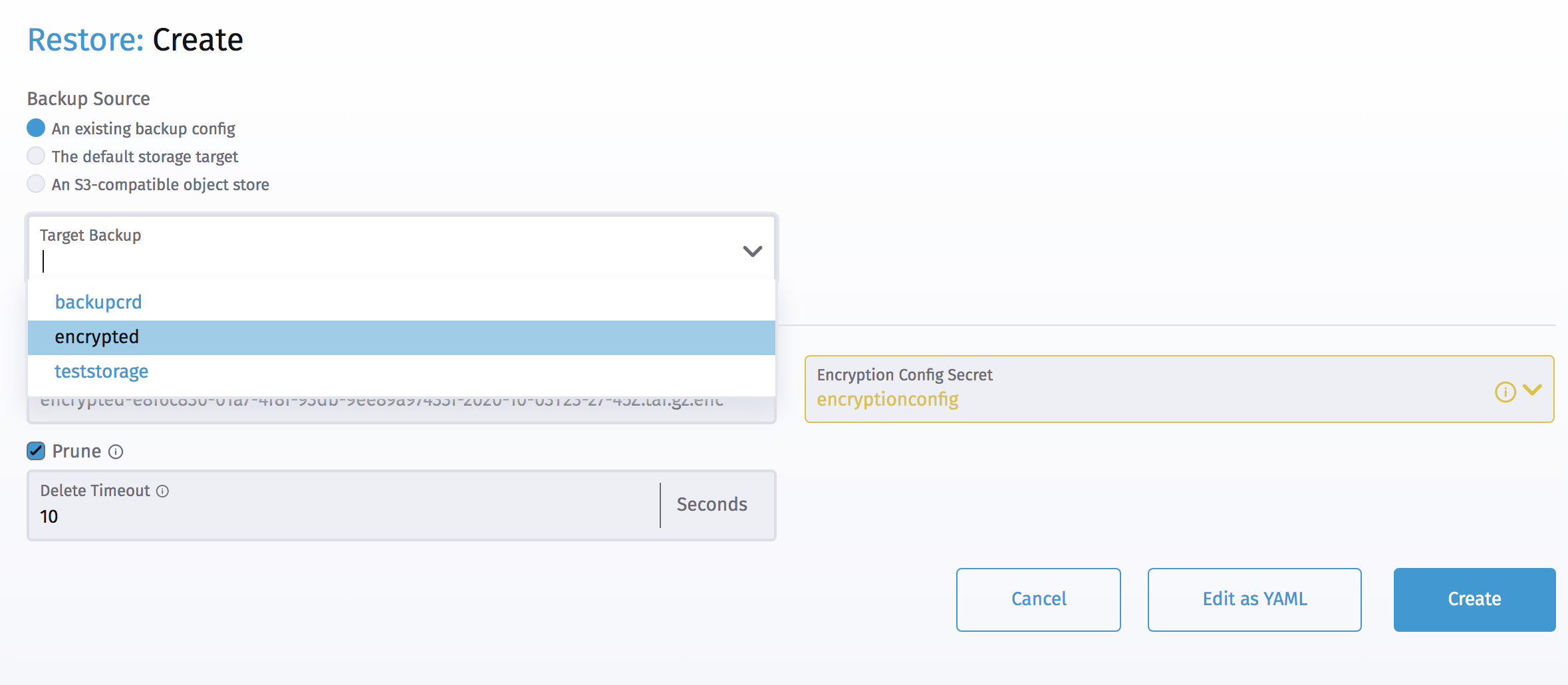 如果备份是在启用加密的情况下创建的,其文件后缀为.enc。选择这样的备份,或提供后缀为.enc的备份文件名,将显示另一个名为加密配置 Secret的下拉菜单。