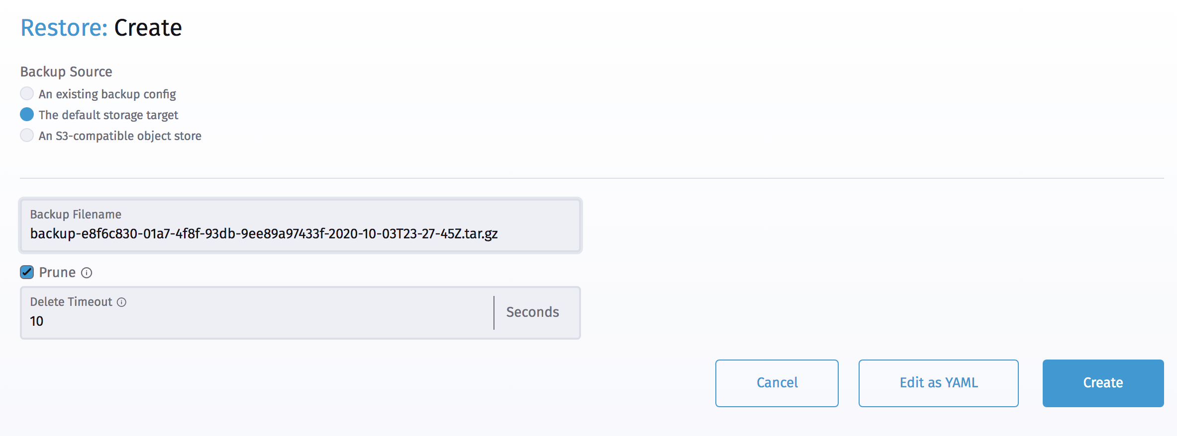 选择该选项将在目标备份下拉菜单中填充该集群中可用的备份。从下拉菜单中选择备份,自动为您填写备份文件名字段,还将把所选 Backup 的备份源信息传递给 operator。