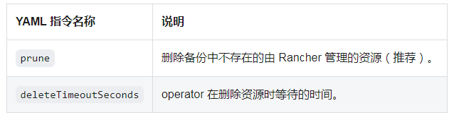 - Prune:为了从备份中完全恢复 Rancher,并回到备份时的确切状态,我们需要删除 Rancher 在备份后创建的任何额外资源。如果Prune标志被启用,operator 就会这样做。Prune 默认是启用的,建议保持启用。