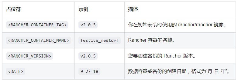 在此命令中,<RANCHER_CONTAINER_NAME>和<RANCHER_VERSION>-<DATE>是 Rancher 部署的环境变量。