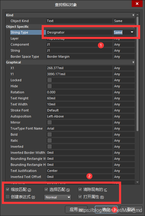 将 Designator 后面的选项改为 Same,应用 确认将所有位号的丝印选中后,确定