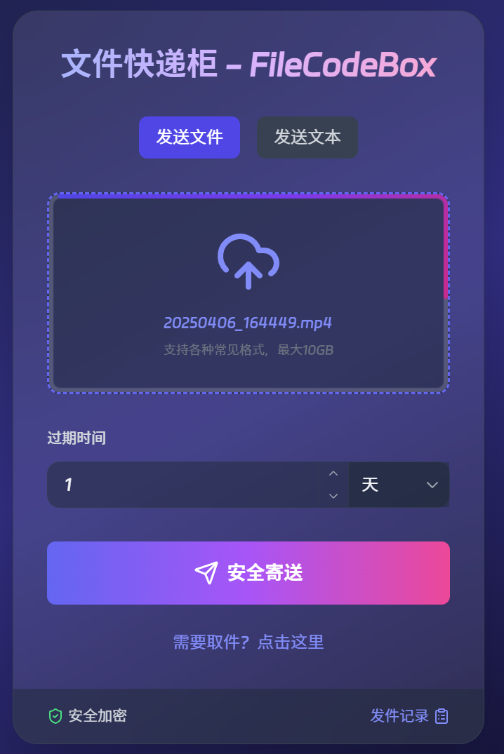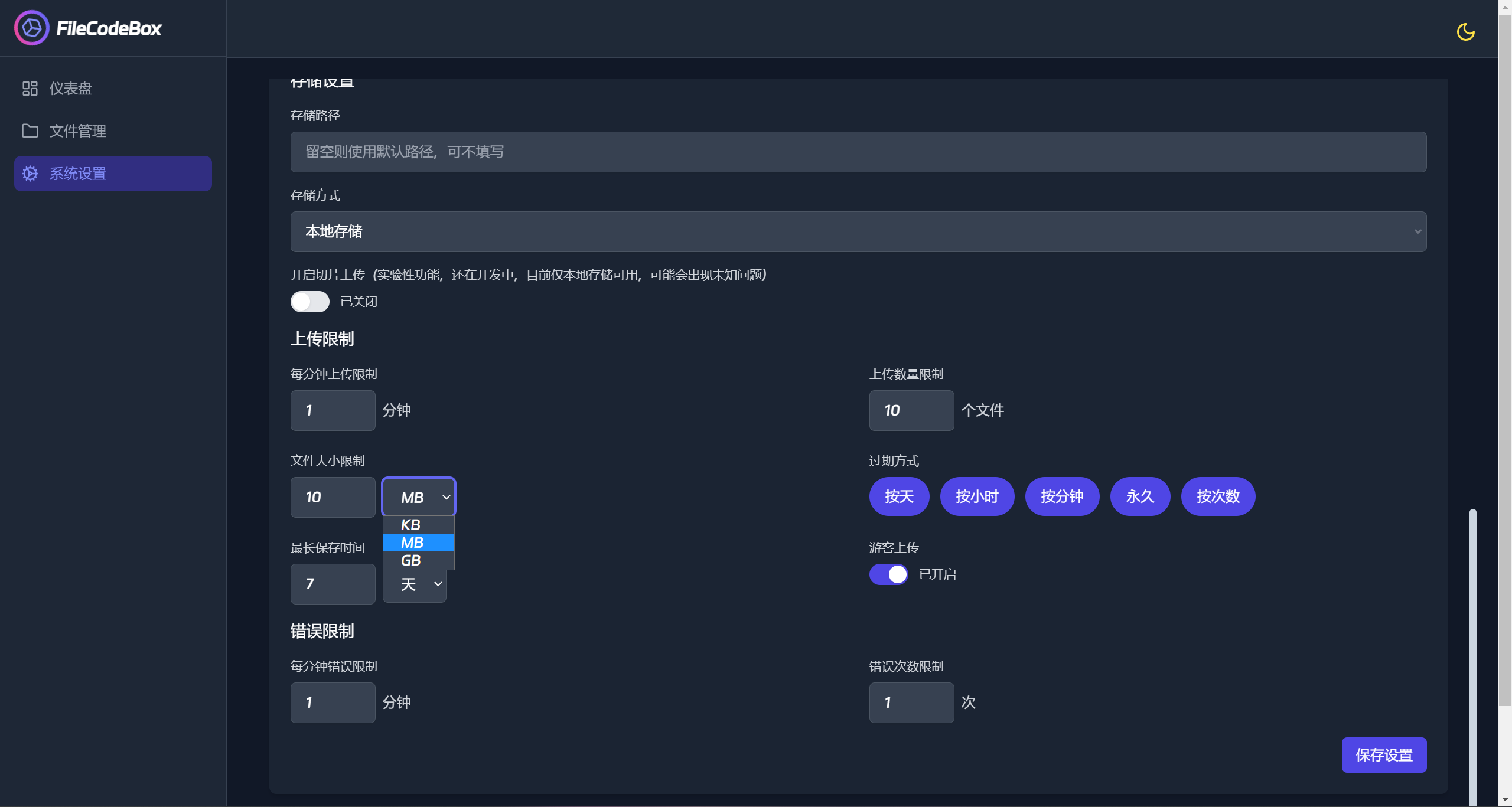 默认密码是:FileCodeBox2023可以在后台修改发送文件大小限制