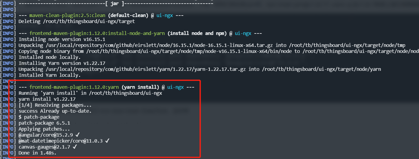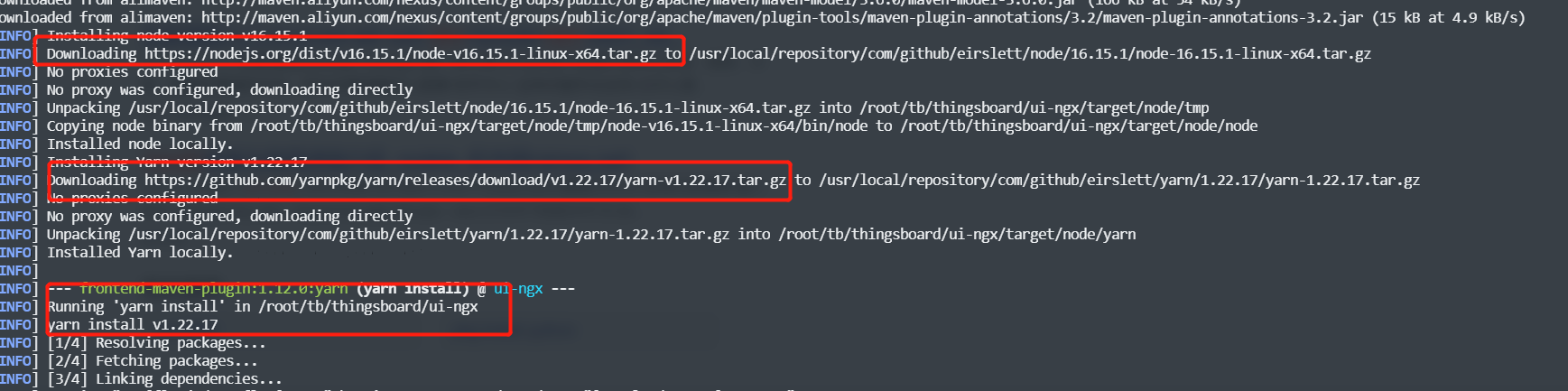到这一步网路不好,就会报错了,上面第一个以及第二个红框都是下载相关的node和yarn的,我们可以自己去下载对应的版本,然后放到对应的 to 哪个目录即可,或者重新执行 mvn clean install -DskipTests 命令编译网络不好的话,报错的概率也很大,我们看到第三个框,有个