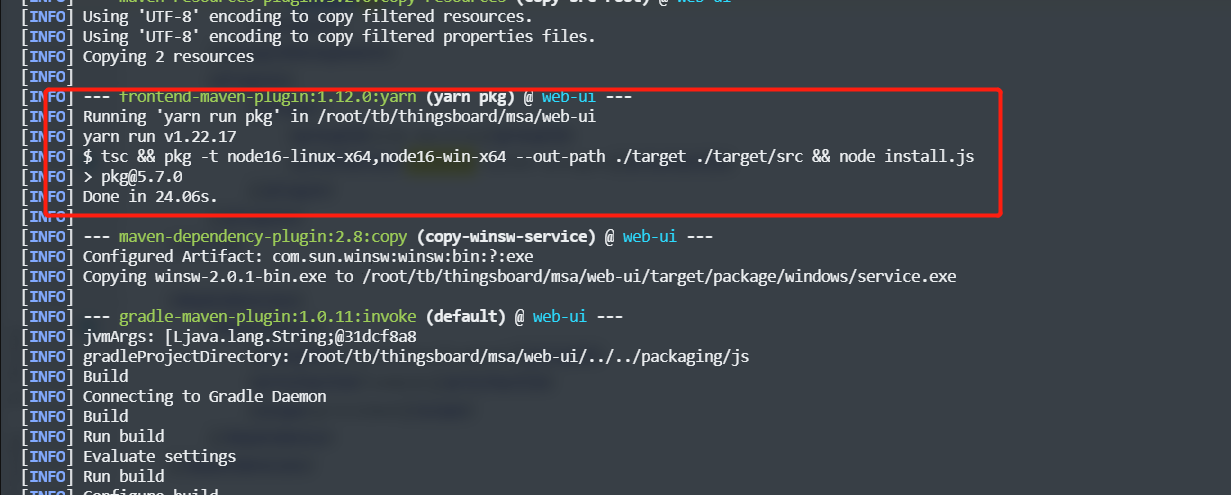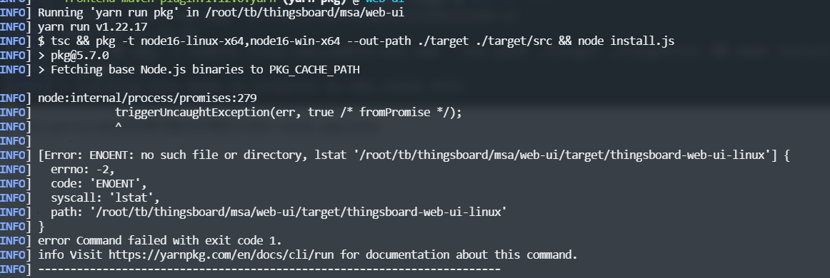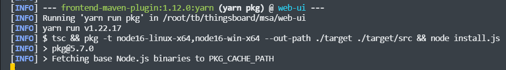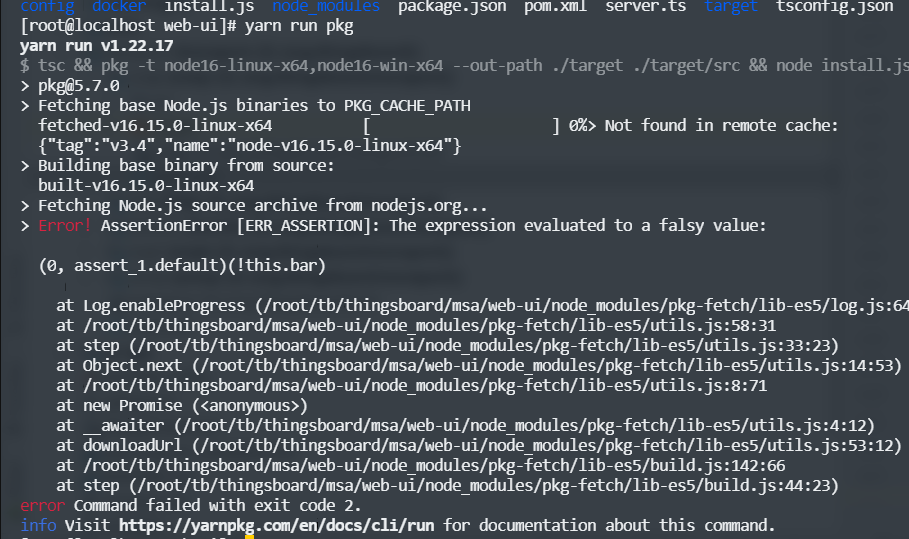 缺少了 pkg-fetch 去github下载 https://github.com/vercel/pkg-fetch/releases 按照上面的提示 v16.15.0下载对应的版本,把node-v16.5.0-linux-x64 改为 fetched-v16.5.0-linux-x64 放到 find / -name .pkg-cache 这个命令查找出来的 .pkg-cache目录下,或者这里下载,cd到msa/web-ui重新执行 yarn run pkg ,ok编译通过,再去项目根目录执行 mvn clean install -DskipTests