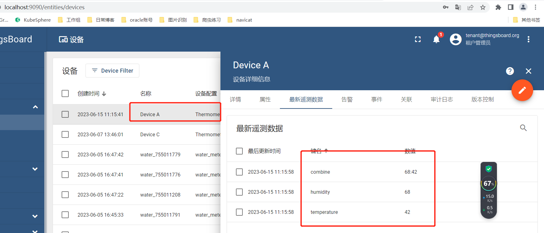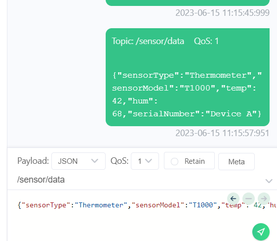 可以看到已经创建了设备 Device A 类型也没错, "temp": 42,"hum": 68 也没有错,