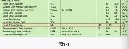 图1-1是ADI的OP07数据表中的输入电气特性的一部分,可以看到在电源电压±15V的条件下,输入电压的范围是±13.5V,如果输入电压超出范围,那么运放就会工作不正常,出现一些意料不到的情况。
