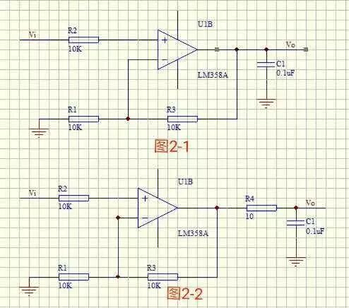 在直流信号放大电路中,有时候为了降低噪声,直接在运放输出并接去耦电容(如图2-1)。虽然放大的是直流信号,但是这样做是很不安全的。当有一个阶跃信号输入或者上电瞬间,运放输出电流会比较大,而且电容会改变环路的相位特性,导致电路自激振荡,这是我们不愿意看到的。