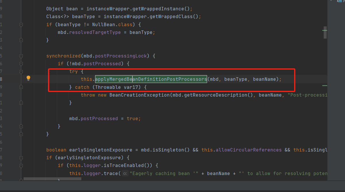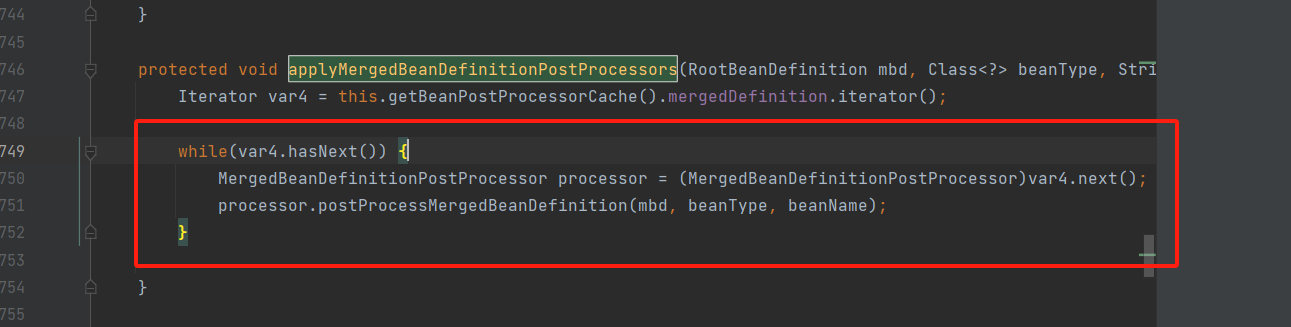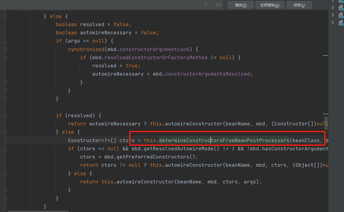 会获取容器中所有的BeanPostProcessor对象,并进行循环筛选出来自于 SmartInstantiationAwareBeanPostProcessor接口的实现类,