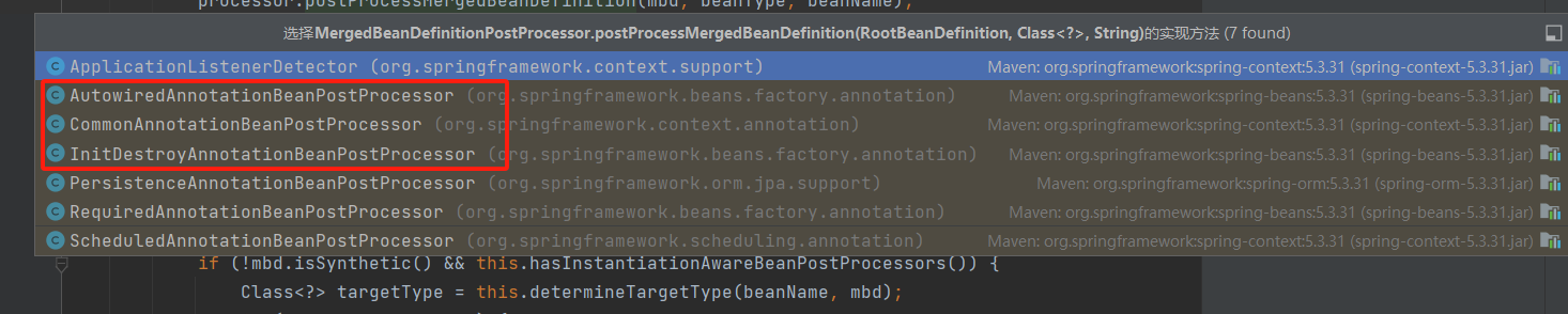 通过BeanPostProcessor,主要是CommonAnnotationBeanPostProcessor(继承自InitDestroyAnnotationBeanPostProcessor)、AutowireAnnotationBeanPostProcessor,获取到BeanDefinition中的注解信息,包括@PostConstruct,@PreDestroy,@Resource(前三个由CommonAnnotationBeanPostProcessor进行解析,都是jdk提供的注解)