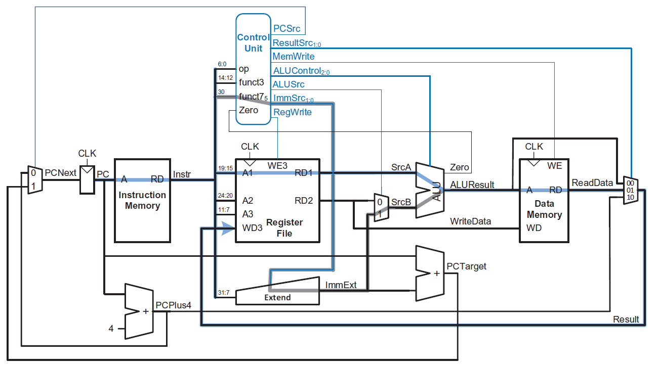 这个图没办法实现auipc和lui指令,需要改进一下。增加ALUSrcA控制信号,当该控制信号为0时srcA等于0,当该控制信号为1时srcA等于RD1。另外增加ResultSrc的选项,当ResultSrc等于2'b11时,Result等于PCTarget。