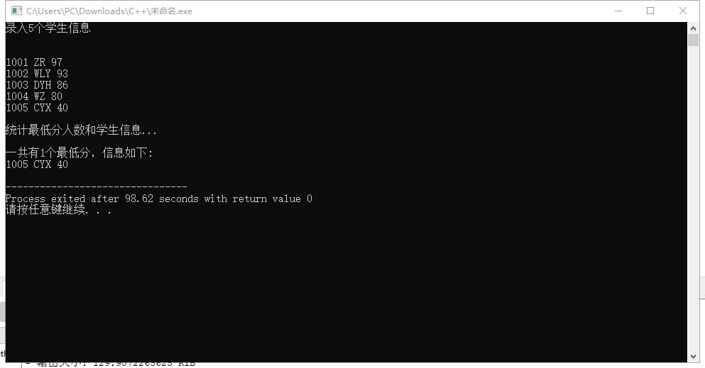 #include <stdio.h> const int N=5; // 定义结构体类型struct student,并定义STU为其别名 typedef struct student { long no; char name[20]; int score; }STU; // 函数声明 void input(STU s[], int n); int findMinlist(STU s[], STU t[], int n); void output(STU s[], int n); int main() { STU stu[N], minlist[N]; int count; printf("录入%d个学生信息\n", N); input(stu, N); printf("\n统计最低分人数和学生信息...\n"); count = findMinlist(stu, minlist, N); printf("\n一共有%d个最低分,信息如下:\n", count); output(minlist, count); return 0; } // 输入n个学生信息,存放在结构体数组s中 void input(STU s[], int n) { int i; for(i=0; i<n; i++) scanf("%ld %s %d", &s[i].no, s[i].name, &s[i].score); } // 输出结构体s中n个元素信息 void output(STU s[], int n) { int i; for(i=0; i<n; i++) printf("%ld %s %d\n", s[i].no, s[i].name, s[i].score); } int findMinlist(STU s[], STU t[], int n) { int i,k=0,min; min=s[0].score; for(i=1;i<n;i++) if(s[i].score<min) min=s[i].score; for(i=0;i<n;i++) if(s[i].score==min) t[k++]=s[i]; return k; }