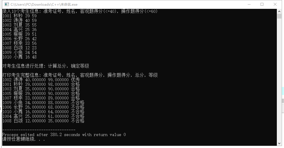 #include <stdio.h> #include <string.h> const int N = 10; // 定义结构体类型struct student,并定义其别名为STU typedef struct student { long int id; char name[20]; float objective; /*客观题得分*/ float subjective; /*操作题得分*/ float sum; char level[10]; }STU; // 函数声明 void input(STU s[], int n); void output(STU s[], int n); void process(STU s[], int n); int main() { STU stu[N]; printf("录入%d个考生信息: 准考证号,姓名,客观题得分(<=40),操作题得分(<=60)\n", N); input(stu, N); printf("\n对考生信息进行处理: 计算总分,确定等级\n"); process(stu, N); printf("\n打印考生完整信息: 准考证号,姓名,客观题得分,操作题得分,总分,等级\n"); output(stu, N); return 0; } // 录入考生信息:准考证号,姓名,客观题得分,操作题得分 void input(STU s[], int n) { int i; for(i=0;i<n;i++) scanf("%d %s %f %f",&s[i].id,s[i].name,&s[i].objective,&s[i].subjective); } //输出考生完整信息: 准考证号,姓名,客观题得分,操作题得分,总分,等级 void output(STU s[], int n) { int i,j;STU temp; for (i=0;i<n;i++) { printf ("%d %s %f %f %s\n",s[i].id,s[i].name,s[i].objective,s[i].sum,s[i].level); } } // 对考生信息进行处理:计算总分,排序,确定等级 void process(STU s[], int n) { int i,j,k;STU temp; for (i=0;i<n;i++) s[i].sum=s[i].objective+s[i].subjective; for(j=0;j<n-1;j++) { for(k=0;k<n-1-j;k++) { if(s[k].sum<s[k+1].sum) { temp=s[k]; s[k]=s[k+1]; s[k+1]=temp; } } } for(i=0;i<n;i++) { if(i==0) strcpy(s[i].level,"优秀"); else if (i>=1&&i<=4) strcpy(s[i].level,"合格"); else if (i>=5&&i<=9) strcpy(s[i].level,"不合格") ; } }