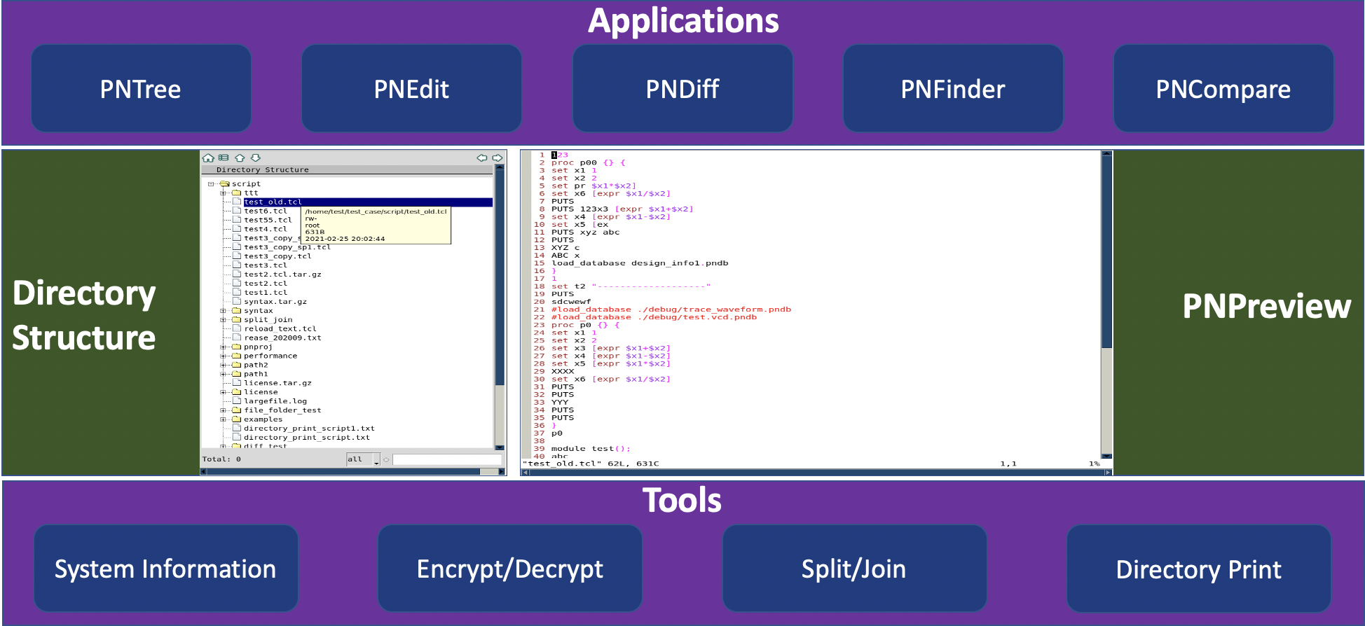 PNFile是一个平台型工具,在该平台上集成了多个应用程序和插件。应用程序有目录结构树PNTree、文本编辑器PNEdit、文本比较器PNDiff、文件搜索器PNFind以及目录比较器PNComp。插件有系统信息查看System Information、文件加解密Encrypt/Decrypt、文件分解合并Split/Join以及目录列表打印Directory Print。