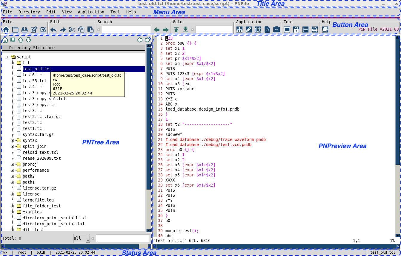 目录结构树是将系统中的目录结构以树状显示和管理,其管理方式和功能与应用程序PNTree是一致的。文件预览窗口是将在目录结构树中选中的文件鼠标左键双击预览(或者是文件预览菜单/按钮打开),文件在预览窗口中打开时会根据其后缀名判断该文件的语法属性并以对应的语法规则做相应的高亮显示,在文件预览窗口中支持简单的文本编辑功能,并对编辑之后的内容重新保存文件。目录结构树和文件预览窗口之间有交互功能,目录结构树上选中一个文件节点用鼠标左键双击或者用鼠标左键按住拖动该节点到文件预览窗口释放都可以将该文件内容显示在文件预览窗口中,同样在文件预览窗口显示的文件也可以用鼠标左键按住拖动该文件内容到目录结构树窗口中也会在目录结构树高亮显示该文件所在的目录节点。