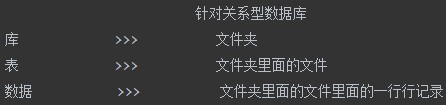 在关系型数据库中,库指代文件夹,表指代文件夹中的文件,数据则指代文件夹里面的一行行记录。