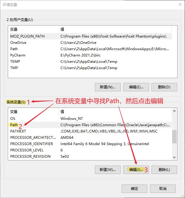 3.弹出环境变量后,在系统变量中寻找Path,找到之后选中点编辑。这里是以win10系统作为演示,win7或其他系统可能会有不同。