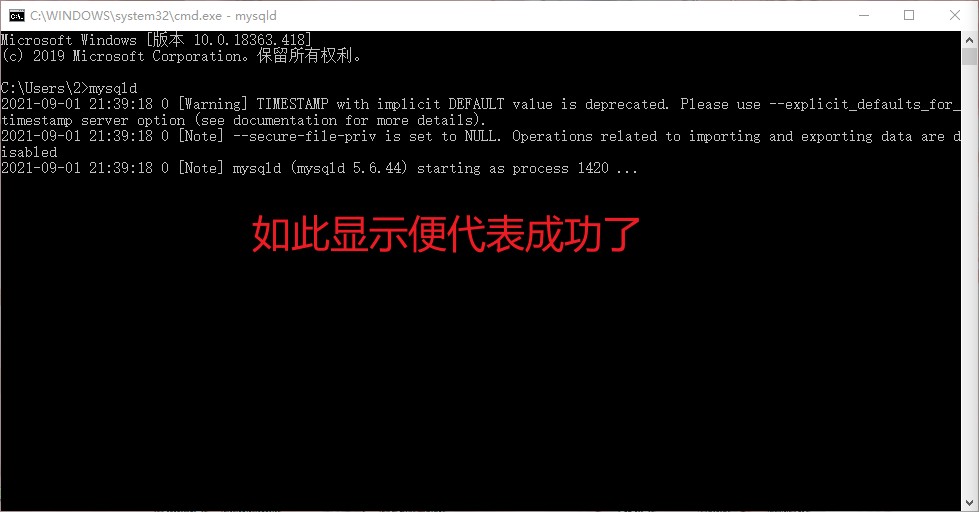 6.上述步骤都完成之后,可以呼出cmd输入命令“mysqld”,若如下图便成功了。