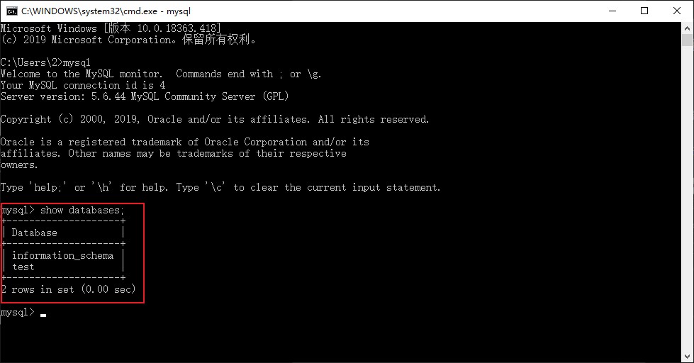 首先来尝试一种简单的功能:直接"myslq",成功的话如下图所示: