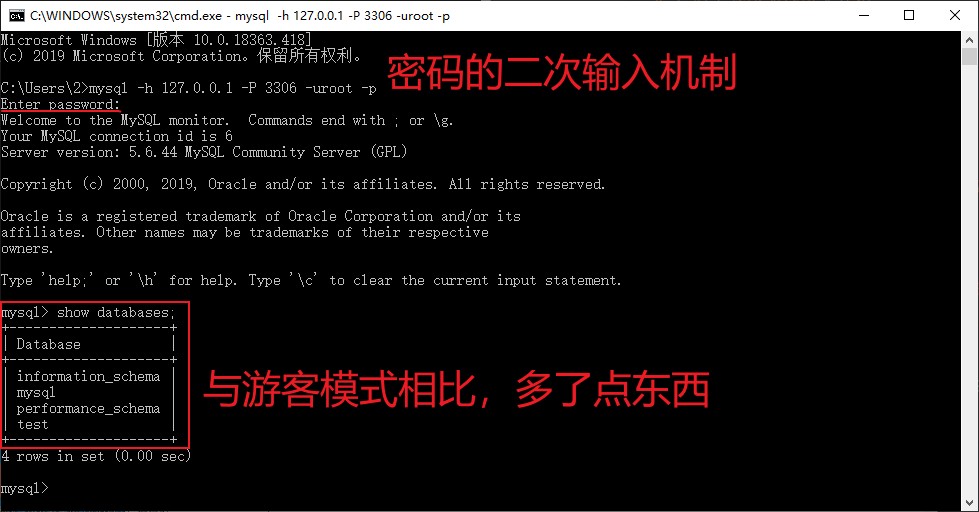 登陆之后在输入"show databases;",可以看到表格中多出了两行,显然是比游客模式多了点功能。