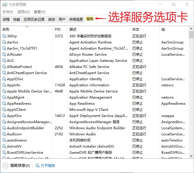 鼠标移到任务栏,然后右键选择任务管理器,再选择服务选项卡。