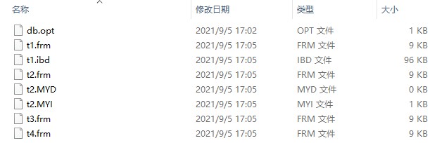 可以看到,在文件夹中出现了许多同名不同后缀的文件。打头的db.opt可以忽略,这是库自带的系统文件。