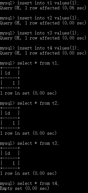 insert into t4 values(1); # 在表t4中插入值‘1’