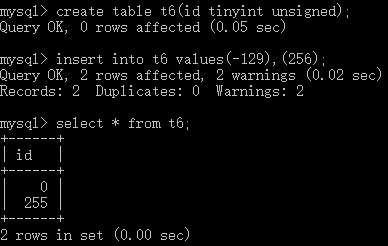 create table t6(id tinyint unsigned); # 创建表t6,定义字段id,整型tinyint类型