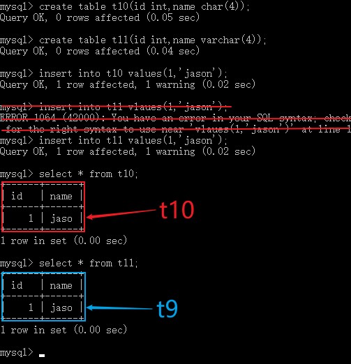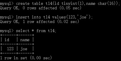 create table t14(id tinyint(1),name char(16)); # 创建表t14,定义字段id,整型tinyint类型,展示宽度1;定义字段name,字符char类型,存储16个字符