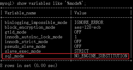 show variables like '%mode%'; # 模糊查询各种模式