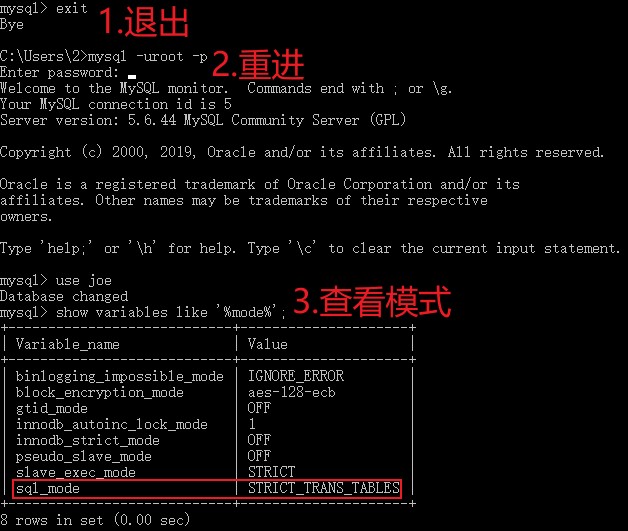 不过即便这样还是没有开启严格模式。因为这需要写入配置文件之中。不过步骤也简单,退出客户端之后重新进入即可。