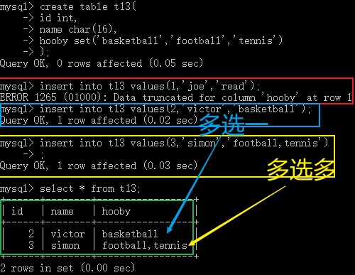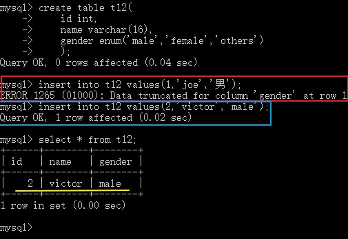 标新立异的joe报错,最终没有输入表里去;中规中矩的victor顺利被输入了表中。再度印证了最开始的定义:枚举类型插入数据的时候只能够插入提前规定好的数据。