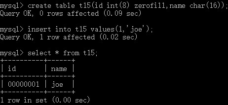 create table t15(id int(8) zerofill,name char(16)); # 创建表t15,定义字段id,整型int类型,显示宽度8位,0填充;定义字段name,字符char类型,存储16个字符