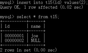insert into t15 values(1,'joe'); # 在表t15中插入值1,joe